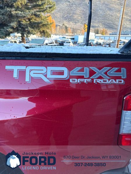 TRD OFF ROAD PACKAGE Tires: P275/65R18 All-Terrain, BF Goodrich, Wheels: 18 x 8J Split 5-Spoke TRD Off Road Alloy, black accents, LED Front Fog & Driving Lights, Engine & Fuel Tank Skid Plates, LED Headlights w/Smoked Housings, Bedside TRD Off Road Decal, TRD Off Road Floor Mats, Trail-Tuned Bilstein Shock Absorbers, SR5 UPGRADE PACKAGE front center console w/3 cupholders and replaces standard equipment column shifter w/floor mounted urethane shift lever and knob, Compass, Anti-Theft Immobilizer w/Alarm, Urethane Tilt/Telescopic Steering Wheel, Auto-Dimming Rearview Mirror, 38 Gallon Fuel Tank Capacity, Front Bucket Seats, 8-way power-adjustable drivers seat w/power lumbar support and 4-way manual adjustable front passenger seat, HomeLink Universal Transceiver, SPRAY-ON-BEDLINER W/DECK RAIL SYSTEM.