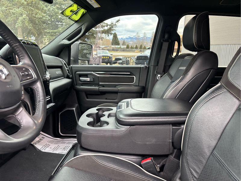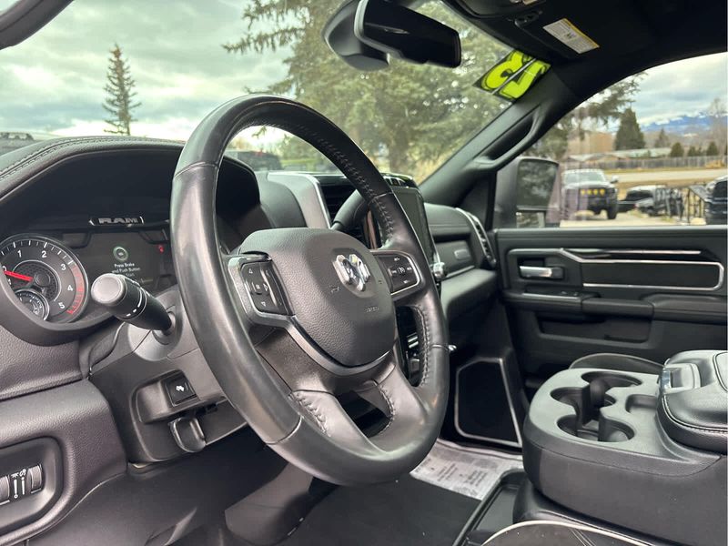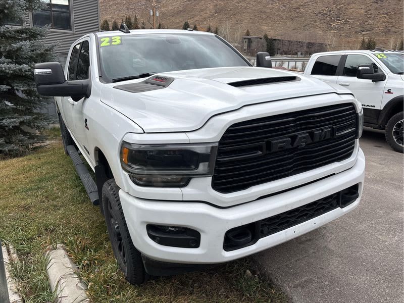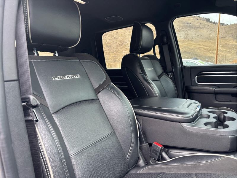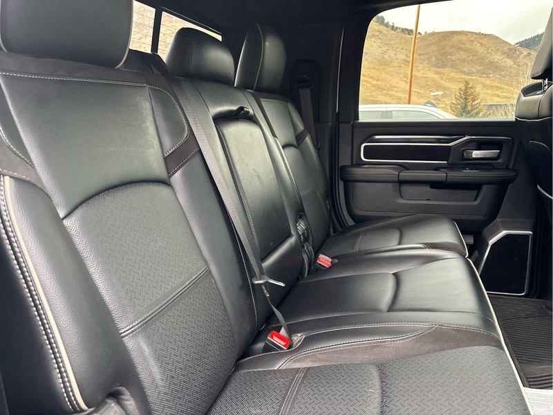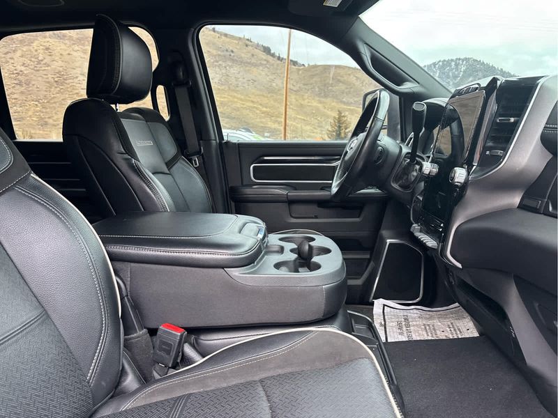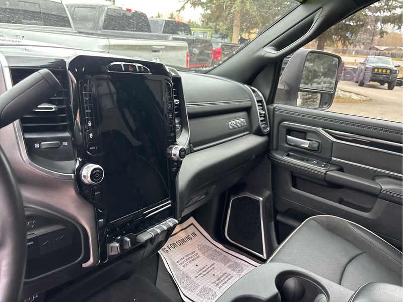 ENGINE: 6.7L I6 CUMMINS TURBO DIESEL Selective Catalytic Reduction (Urea), Dual 730 Amp Maintenance Free Batteries, Cummins Turbo Diesel Badge, Heavy Duty Engine Cooling, Supplemental Heater, Tow Hooks, Diesel Exhaust Brake, Front Bumper Sight Shields, Capless Fuel Fill w/o Discriminator, NIGHT EDITION Black RAM Head Tailgate Badge, Wheels: 20 x 8.0 Black Painted Aluminum, Black Headlamp Bezels, Sport Performance Hood, Black Wheel Center Hub, Tires: LT285/60R20E OWL On/Off Road, Black Exterior Truck Badging, Gloss Black Grille Billets/Accents, Body Color Grille Surround, Black Interior Accents, Black Tail Lamp Bezels, ParkSense Front/Rear Park Assist System, LARAMIE LEVEL 1 EQUIPMENT GROUP Rear Window Defroster, Blind Spot & Cross Path Detection, Rain Sensitive Windshield Wipers, Power Adjustable Pedals w/Memory, Rear Power Sliding Window, 12 Touchscreen Display, Auto Dim Exterior Mirror, Front LED Fog Lamps, LED Reflector Headlamps, Foam Bottle Insert (Door Trim Panel), Radio: Uconnect 5 Nav w/12.0 Display, Mirror Power Heat Fold Memory Tele, Remote Tailgate Release, Auto High Beam Headlamp Control, Exterior Mirrors w/Memory, Radio/Driver Seat/Mirrors/Pedals Memory, Auto Dim Exterior Passenger Mirror, Auto Adjust In Reverse Exterior Mirrors, ParkSense Front/Rear Park Assist System, TOWING TECHNOLOGY GROUP Center Stop Lamp w/Cargo View Camera, Surround View Camera System, Trailer Reverse Guidance, TRANSMISSION: 6-SPEED AUTOMATIC (68RFE) Urethane Shift Control.